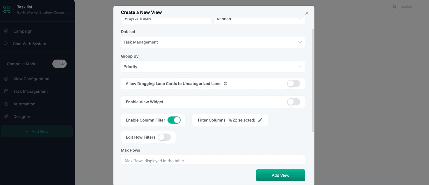 Sort By: Choose which column sorts cards within the lane (Due Date, Priority, Created Date, or any field from your dataset)