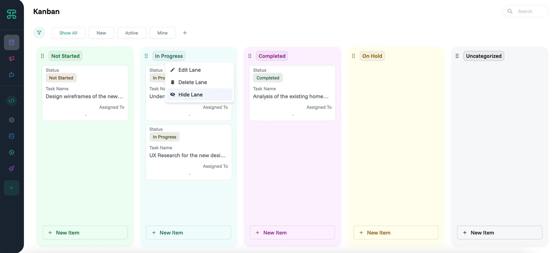 Hide Lane - Temporarily collapse lanes you're not actively working with. Hidden lanes preserve their cards and settings, reducing visual clutter without losing data.