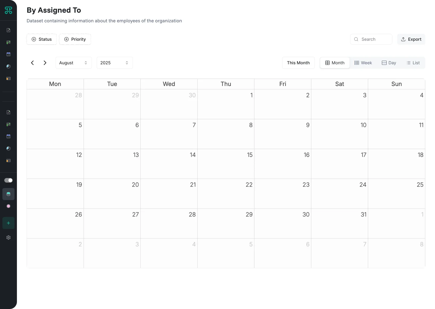Time-based visualization for anything with dates. Calendar views reveal scheduling patterns, conflicts, and opportunities at a glance.
