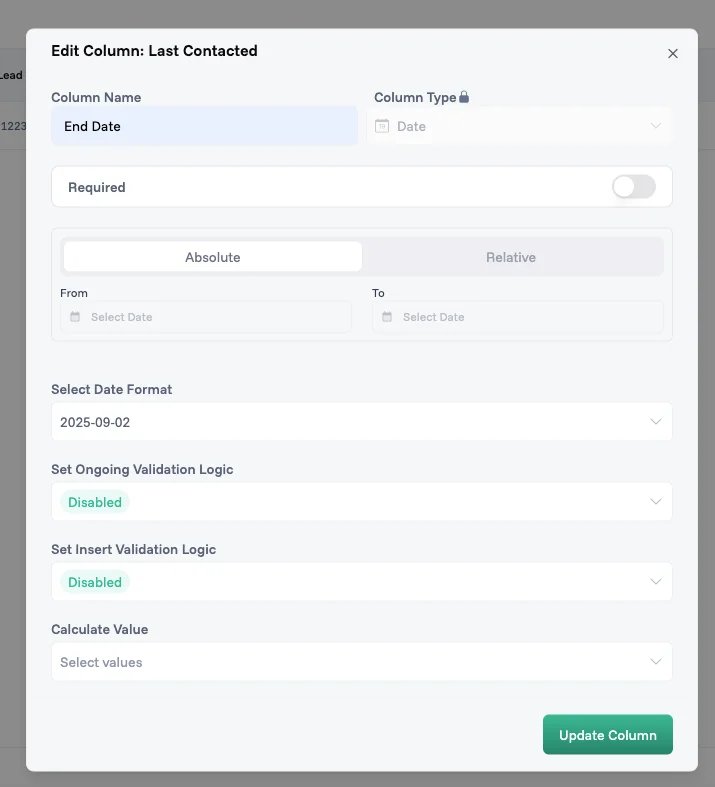 How to Access: Navigate to your Board β Enable Build Mode β Click any column header β Select "Set Ongoing Validation Logic" (for updates after creation) or "Set Insert Validation Logic" (for validation only during record creation).