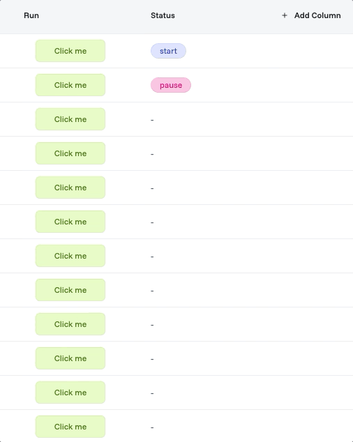The Button column type transforms static data views into interactive command centers. Place a "Generate Invoice" button directly in your orders table. When clicked, it triggers an automation that pulls order data, generates a PDF, emails the customer, and updates the order status—all without leaving the current view.