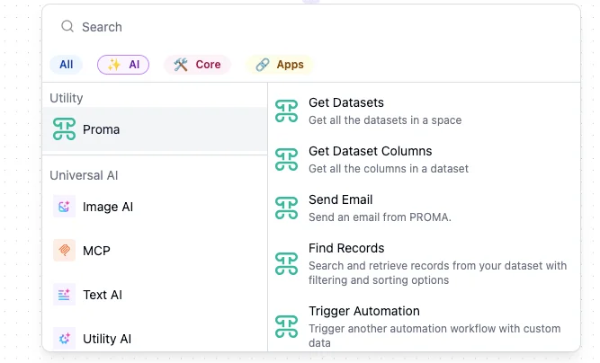 Each connector handles authentication, data formatting, and error recovery. You focus on what to do; Proma handles how to do it.