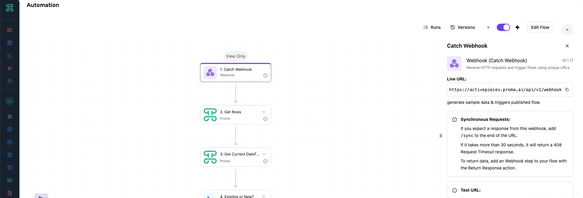 Webhook triggers listen for incoming HTTP requests at a unique URL. When your e-commerce platform processes an order, your shipping provider updates tracking information, or your monitoring service detects an issue, web hooks ensure Proma responds immediately.