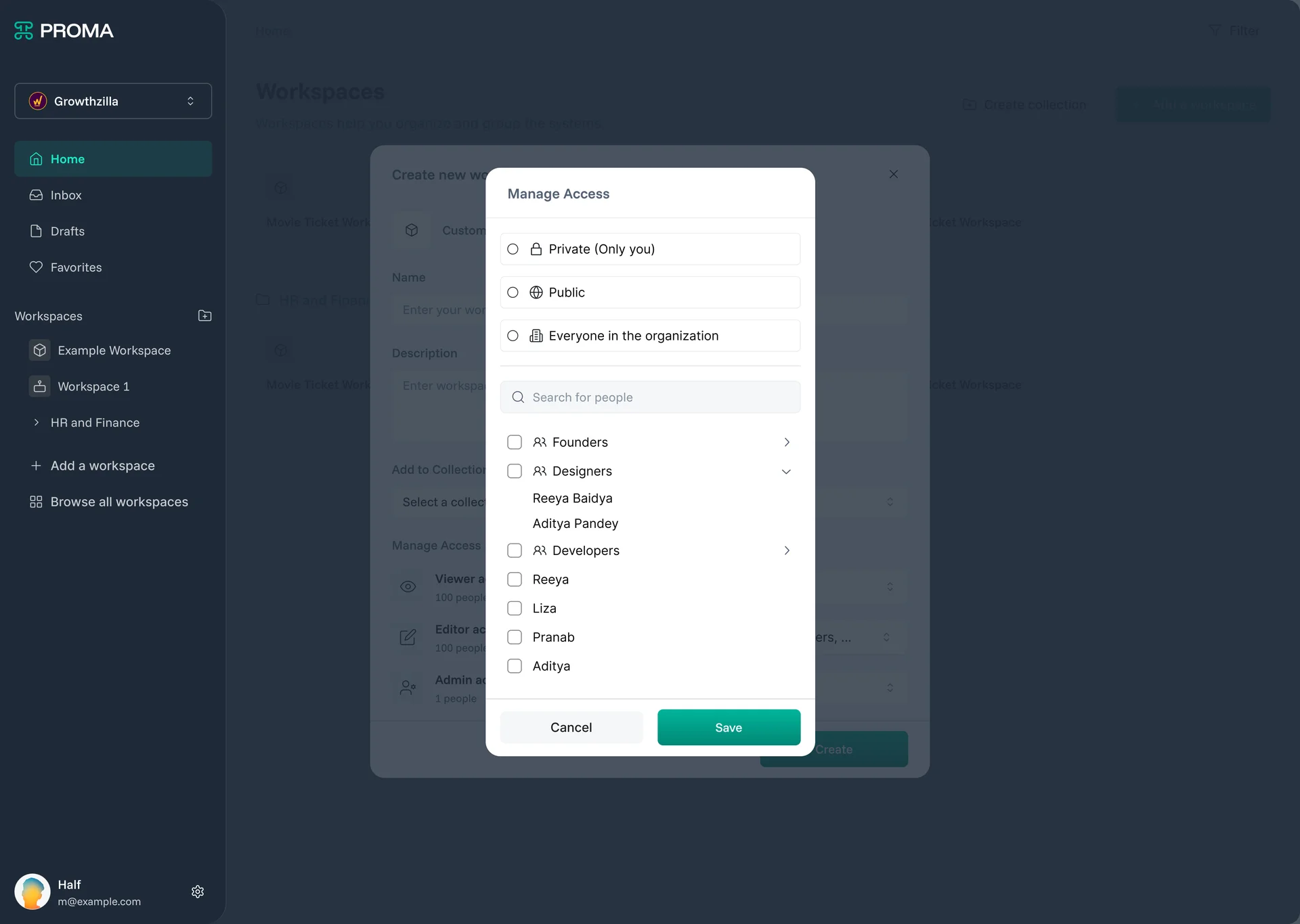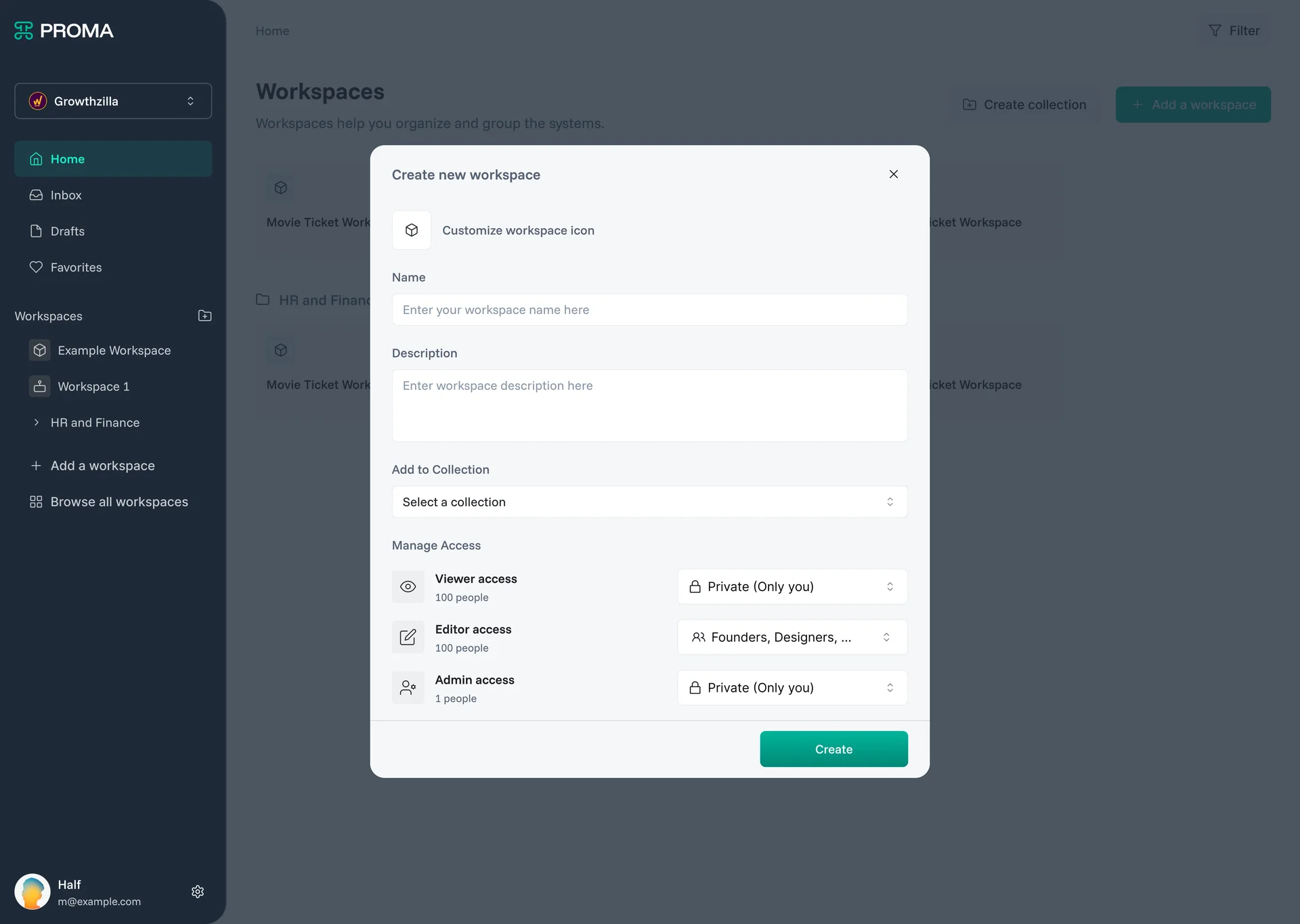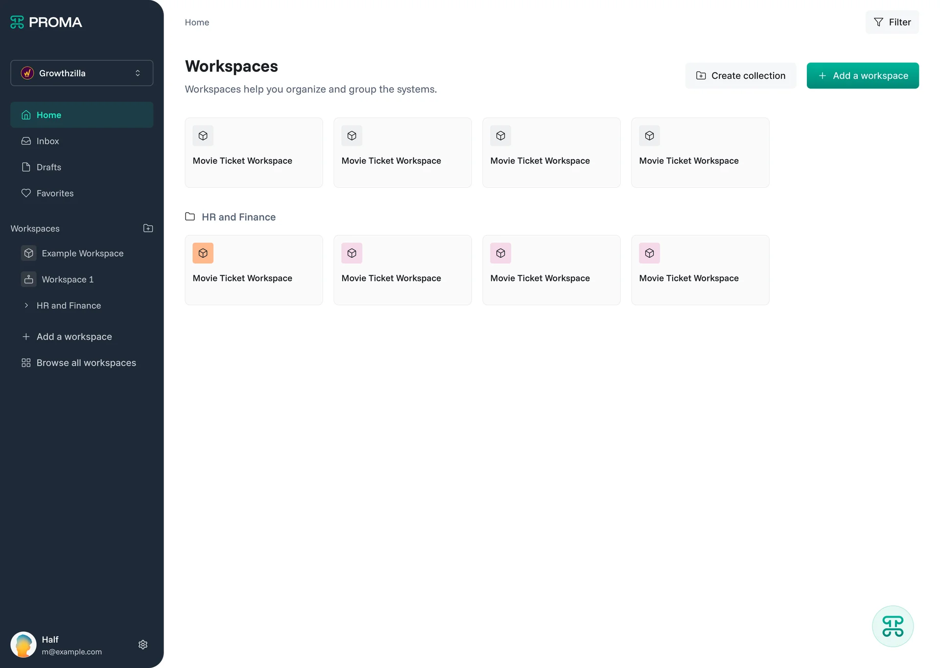 The Proma Workspace is your organization's command center—the main interface where you navigate and manage your entire Proma organization. Think of it as the digital equivalent of your business headquarters, where all your spaces, systems, and collections come together in one cohesive view.